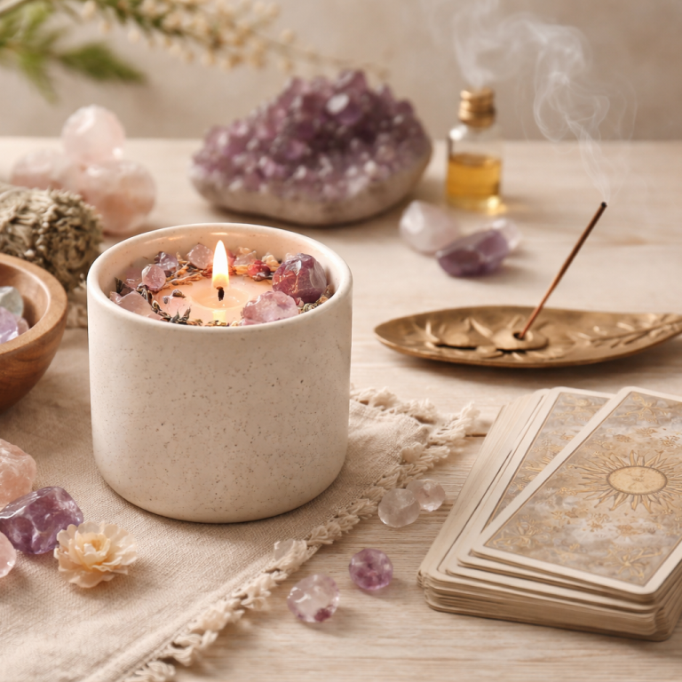 Plongez dans un univers de bien-être et de spiritualité grâce à nos bougies incrustées de pierres naturelles, encens, porte-encens et oracles. Des articles pensés pour vous aider à retrouver harmonie, détente et paix intérieure.